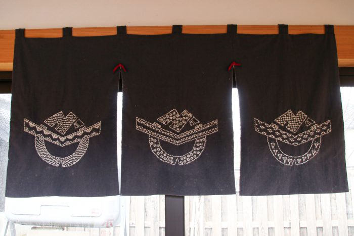 入り口に”遊佐刺子”ののれんがお出迎え。独自の文様もある伝統の刺子です。遊佐町の町章のマークですね。