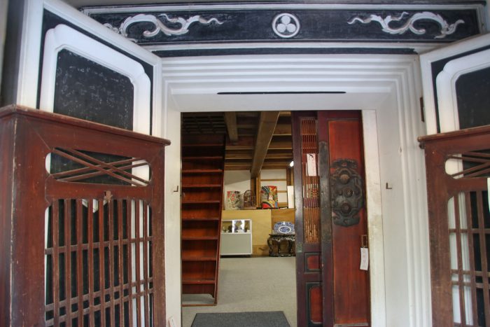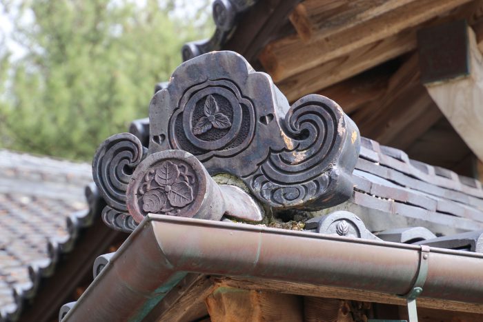 東土蔵の入り口。西土蔵の鏝絵と違いますね!青山家の家紋の三つ柏も背景が白黒違っています。さすが凝っています。
