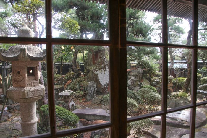 昔の手作りのガラス窓から見るお庭。巨岩や名石、灯篭が枯山水庭園にひしめいてます!→→もうたくさんありすぎてこの表現に(笑)
