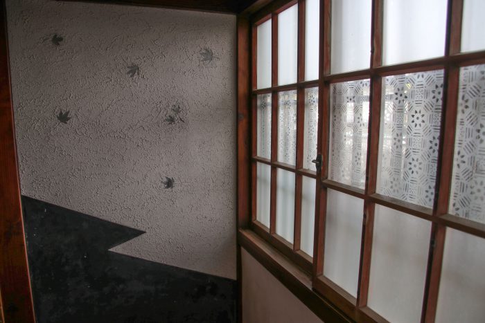 この廊下の壁の模様、デザインがオシャレで好きですね。ガラスの模様もレトロでかわいい(明治期に長崎で作られた高価な絵入りガラスだそう)。