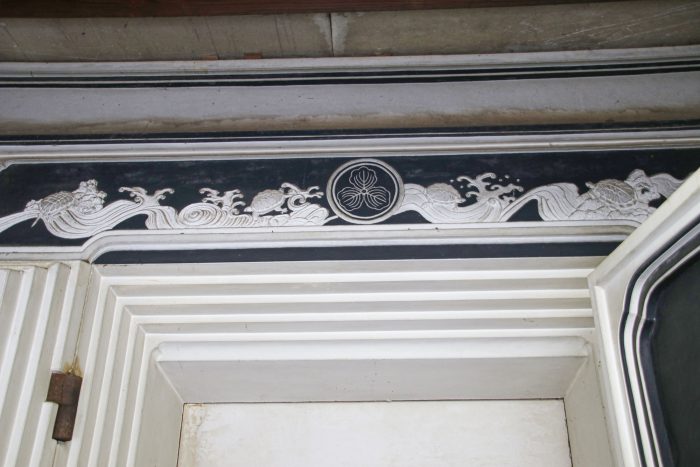 西土蔵(受付)の鏝絵。亀がリアルでいい感じです。(受付内にあるので非公開です。今回は特別に見せてもらいました!)