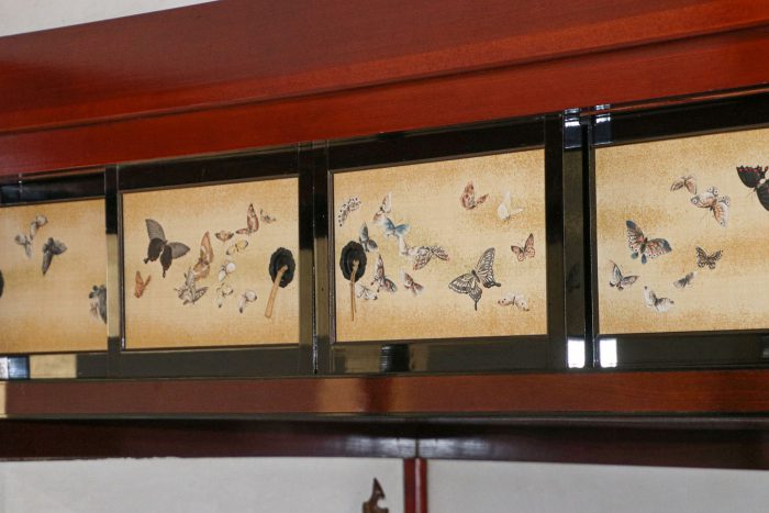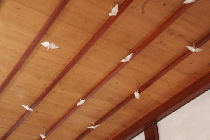 離れ上座敷の天井の折り鶴。とてもオシャレだなぁ!と感心して見ていたら、なんと、ハエどまりと言われるもの(ハエが白いものにとまる習性を利用したもの)で天井の汚れ防止と美観のためだそう。もう感心しちゃいました。